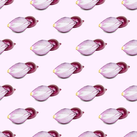 Red onions pattern on a light purple background. Sweet onions for salads.