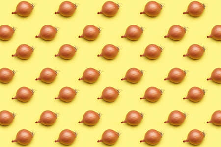 Red onion with husk lies on a yellow background