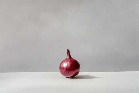 A single red onion rests on a pristine white table, showcasing its vibrant color and smooth texture in a minimalist setting with studio lighting.