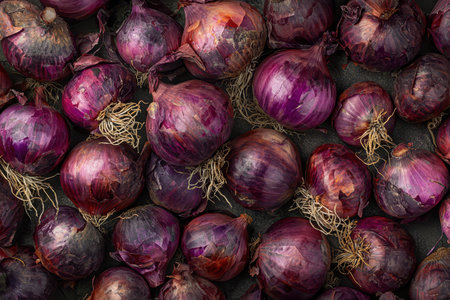A rich visual display of freshly harvested red onions, showcasing their vibrant colors and textures, perfect for culinary inspiration and food photography.