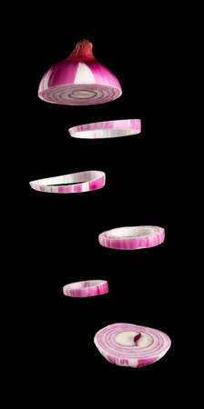 flying rings of sliced purple onion on black background, ingredient for salad, close up