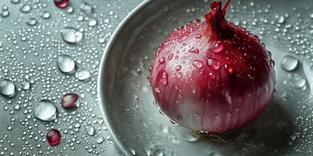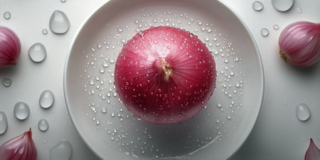 A vibrant red onion with glistening water droplets sits on a white plate. The setting features soft lighting, highlighting its textures and colors.