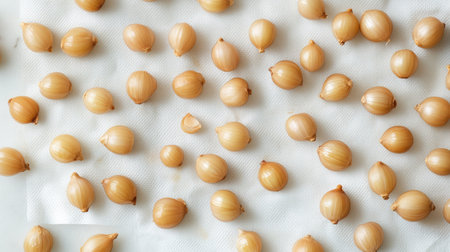 A beautiful arrangement of freshly harvested small yellow onions laid out on a paper towel, showcasing the rustic charm and freshness of vegetables ready for cooking or storage.