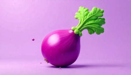 Purple onion with green leaf on purple background. 3d illustration