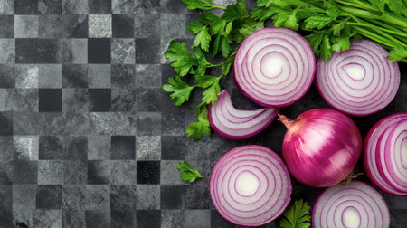 A vibrant display of fresh red onion slices and parsley, ideal for culinary use. Perfect for recipes, cooking illustrations, and healthy meal inspirations.