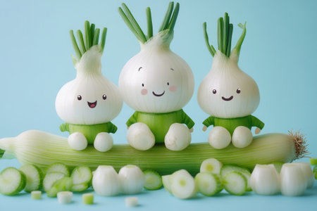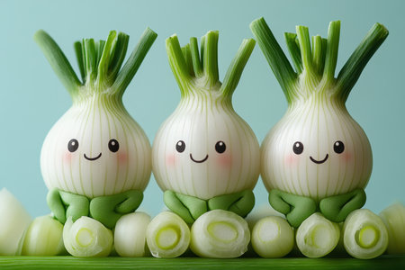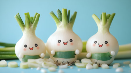 Three adorable onions with smiling faces are displayed in a bright and cheerful arrangement. They sit alongside freshly chopped green onions on a light blue background.