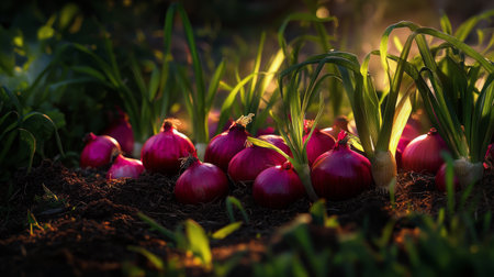 Red onions grow in rich soil, illuminated by golden light at sunset. Lush green tops reach upward, creating a vibrant contrast with the earthy surroundings, showing a bountiful harvest.
