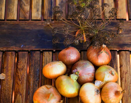 bulbs from garden on wooden table. Harvest fresh vegetables for vegetarians