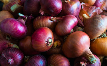 Fresh red onion piled on the market. Food backgroumd. Harvest. Healthy eating. Vegan and vegetarian