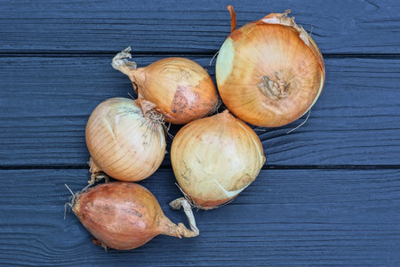 pile fresh brown onions lie on a black wooden table