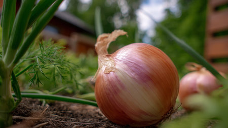 Onion in the garden, selective focus, shallow depth of field