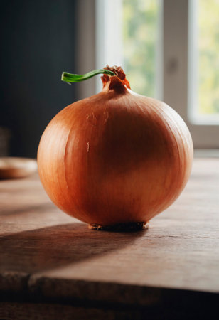 Onion on Wooden Table. An onion sits prominently on top of a sturdy wooden table