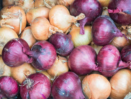 Background of yellow and red onion close up. Yellow and red onion pattern on sale at the market.