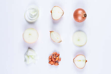 Set of red onions, small shallots and onions on a white background. top view.