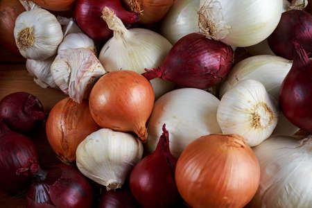 Group of whole vegetables of red onions and yellow onion on a wooden kitchen board, close up