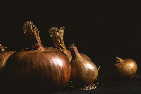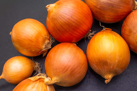 Several large yellow bulbs onion on a dark black background. Top view.