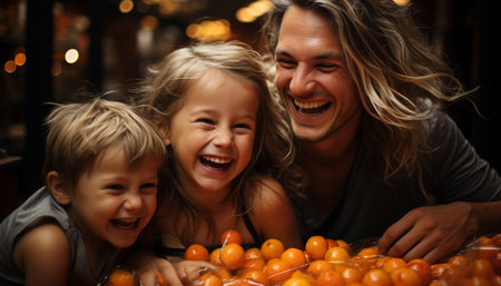 A joyful family, smiling and laughing, enjoying together playfulness indoors generated by artificial intelligence