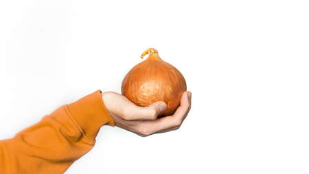 Big onion head in hand on a white background. Isolate Huge vegetables, farm crop production.