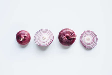 top view of cut and whole red onion on white background