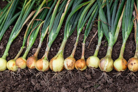 Harvest of fresh ripe organic pesticide free onion on the ground. Set in a row outside to naturally dry before storage. Healthy vegetables.