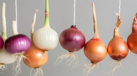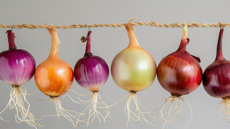 This vibrant image showcases a variety of fresh onions with visible roots, hanging artistically against a neutral background. Perfect for culinary use or gardening themes.