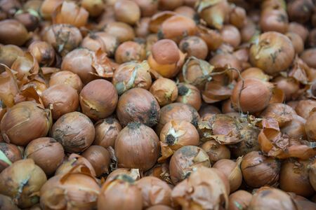 Fresh onions on a market stall. Selective focus. Shallow depth of field