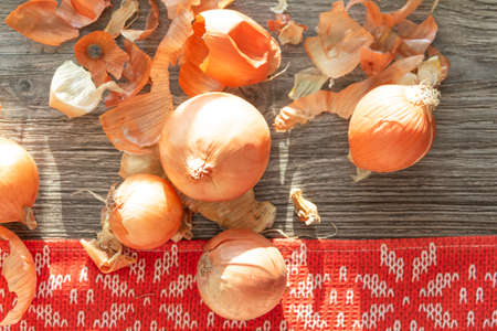 Onions, napkins and onion husks are in the kitchen, on a wooden, gray table