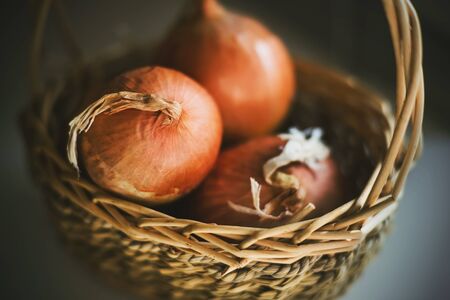 Three large ripe onions lie in a small wicker basket with an elegant handle. Harvest from the garden.