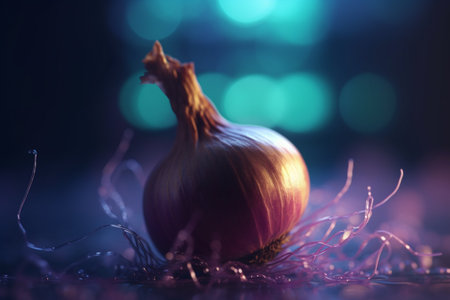 A single onion sitting on a white surface. AI generative image.