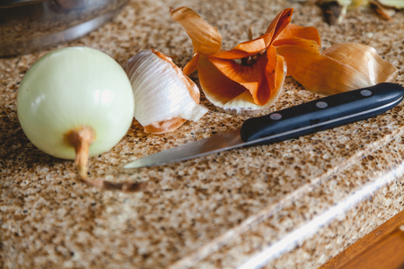 Onion peel small knife and peeled onion lay on a marble top