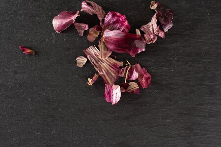 Lot of pieces of stale red onion flatlay on grey stone