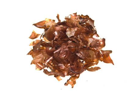 Red onion husks on white background. View from above. Copy space.