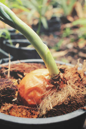 Shallot on the ground in the garden, shallow depth of field