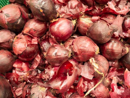 Fresh purple onions stacked together at market