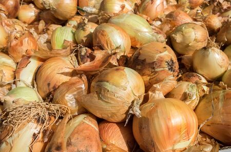 A lot of fresh organic onions on market stall or in groceries shop area. Onion background