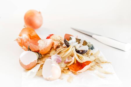 Organic home cooking food waste ready to compost. Ecological concept. Food leftovers, Vegetable Peelings on kitchen table. Environmentally responsible behavior, waste management, recycling garbage.