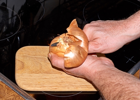 Chef slicing Onion, Allium cepa on the cutting board with a knife.