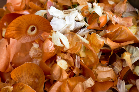 Organic biological kitchen waste, compostable food scraps, rotten food and leftovers from cooking, prepared for composting, Onion peel, Potato peel, Carrot husks, Orange peel