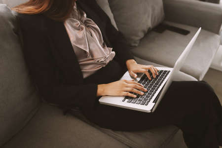 Woman work at the notebook sit on sofa at home concept for alternative office freelance.