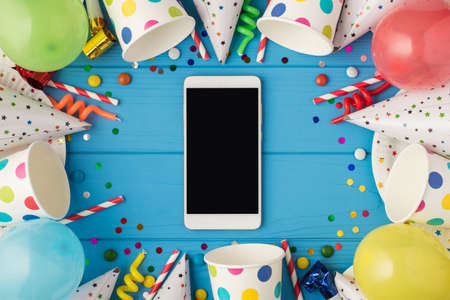 Top view photo of birthday composition party accessories and smartphone with copyspace in the middle on isolated blue wooden table background