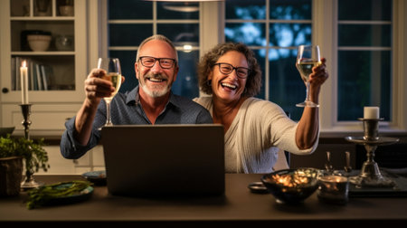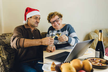 Mature couple having video conversation on laptop during Christmas celebration with relatives during online Christmas celebration at home in period of coronavirus pandemic
