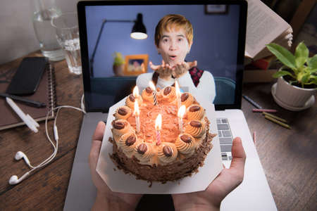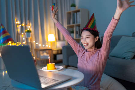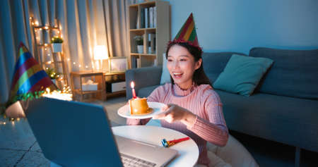 asian young woman wearing birthday hat has video chat online by laptop while celebrating and giving cake for her boyfriend