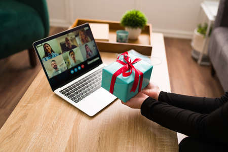 Thank you for my present! Person seen from behind at home showing a gift and celebrating her birthday with friends on a video call