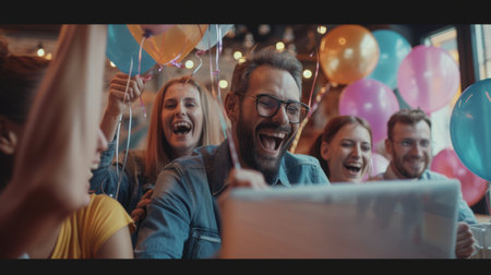 A business team gathered around a laptop, cheering and celebrating as they view their project's success on the screen, balloons and streamers adding to the festive atmosphere
