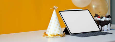 Online cerebration concept with blank screen tablet and party hat on white table with decorations on yellow wall background