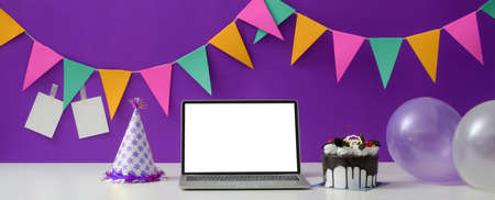 Online birthday party concept with blank screen laptop, cake, party hat and balloon on white table with decorations on purple wall