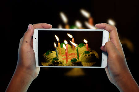 photographing birthday cupcake with candle by phone