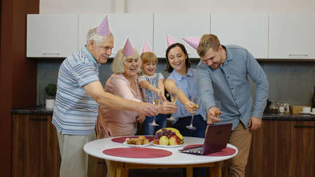 Happy multigenerational family members making birthday anniversary surprise sending congratulations online with laptop during coronavirus, covid-19 quarantine lockdown. Together. Families concept