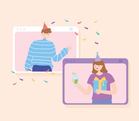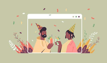 couple in festive hats celebrating online birthday party man woman in computer window drinking cocktails