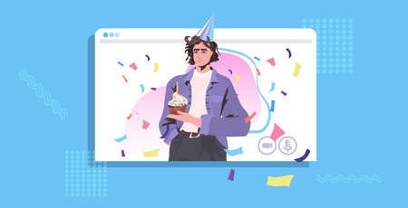 man in festive hat celebrating online birthday party guy in web browser window holding cupcake